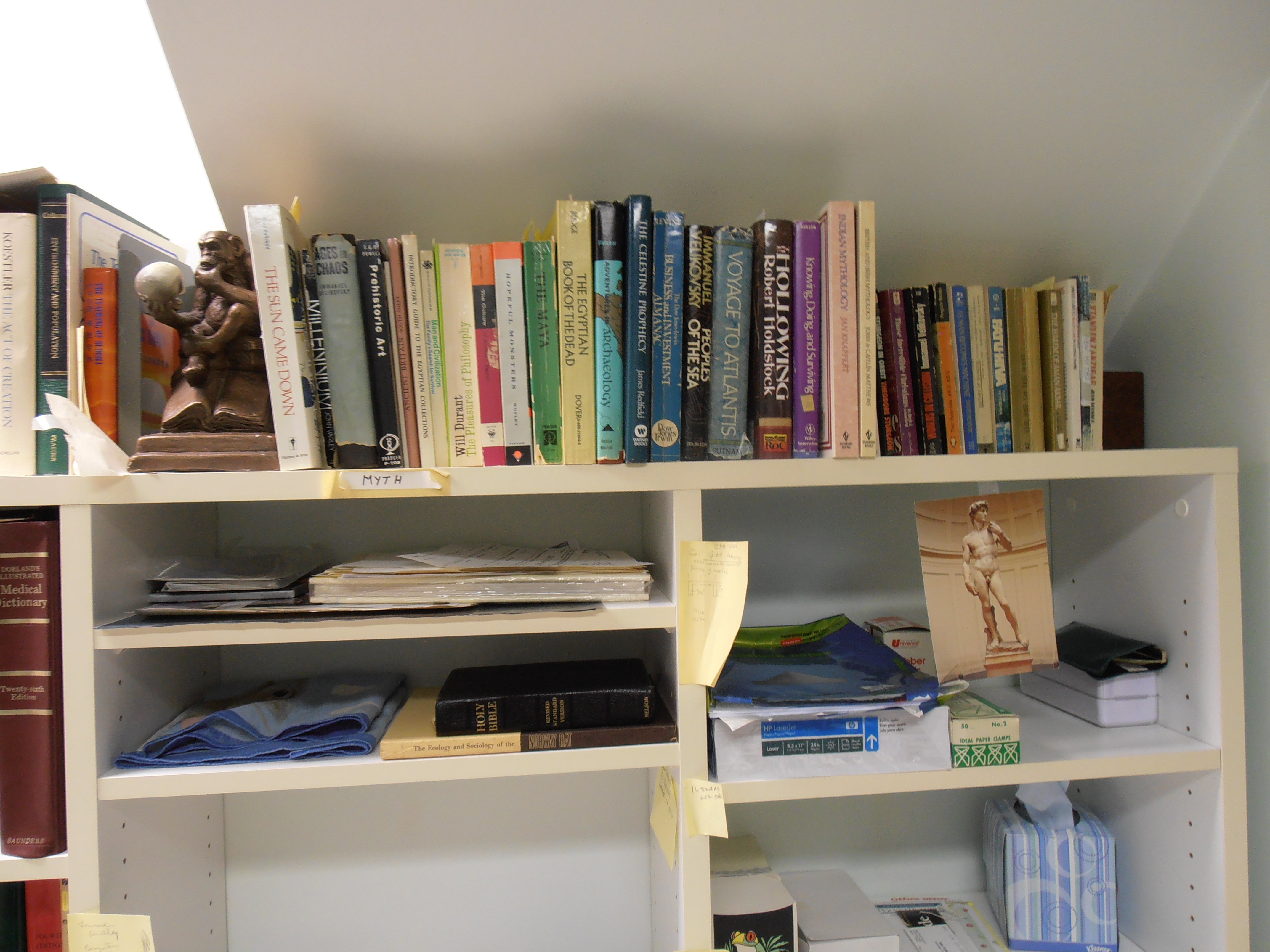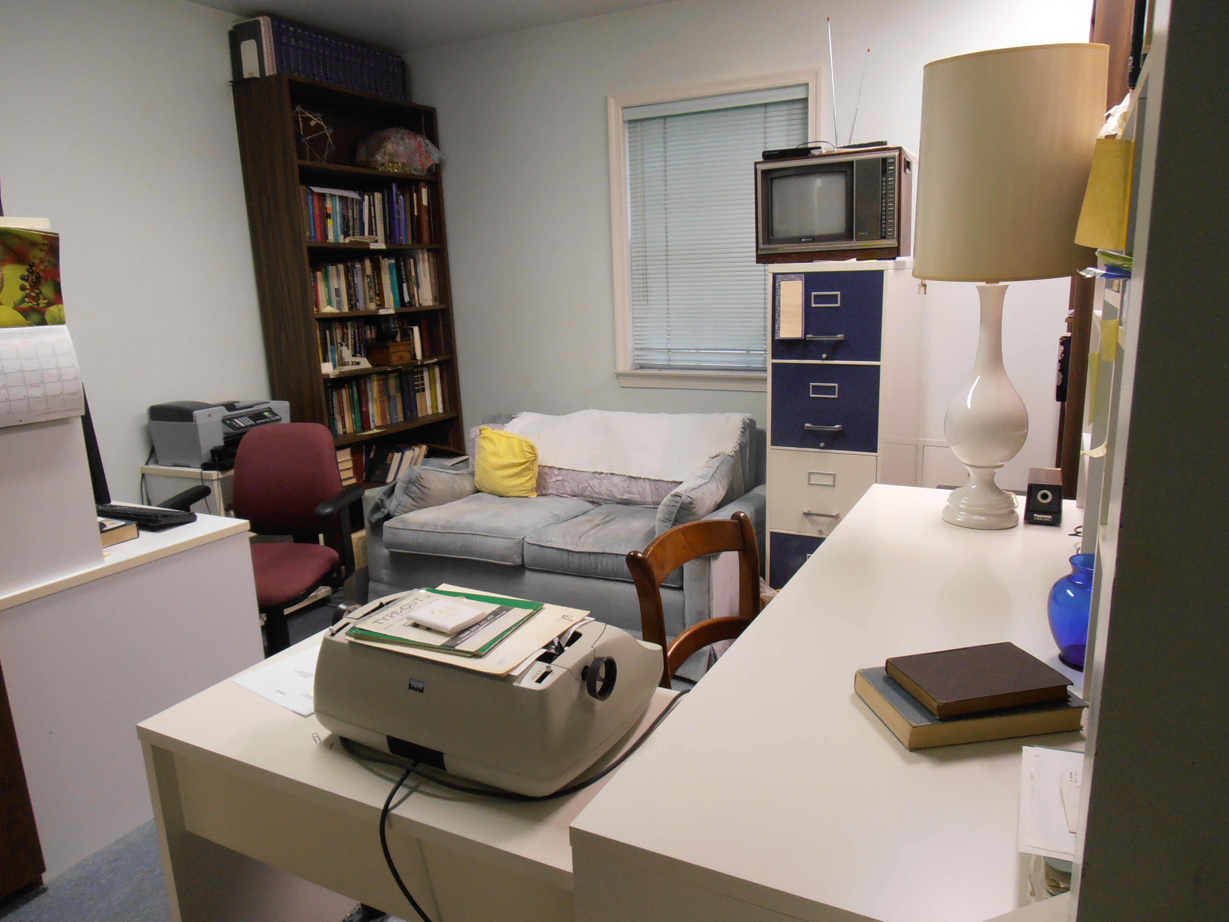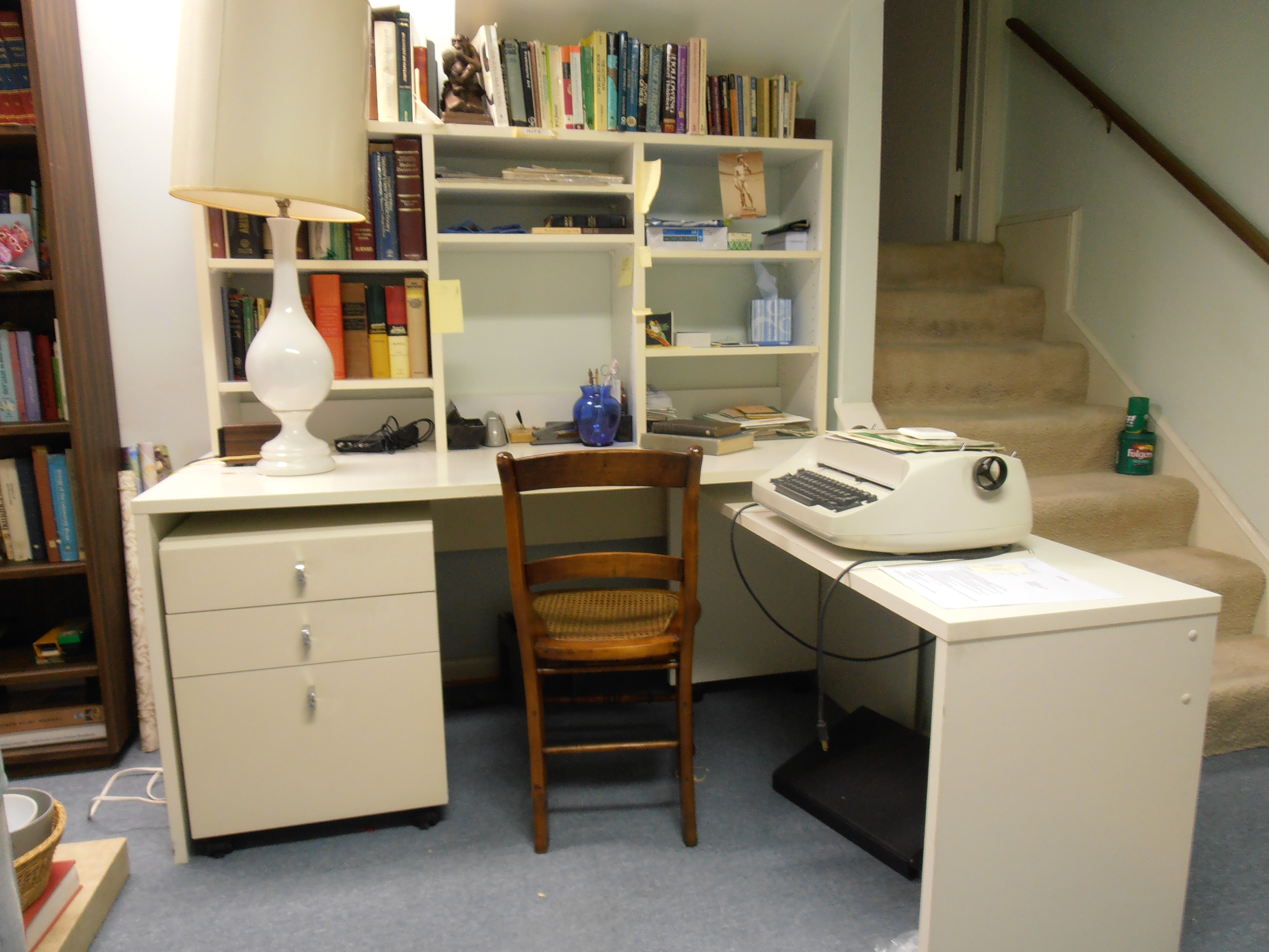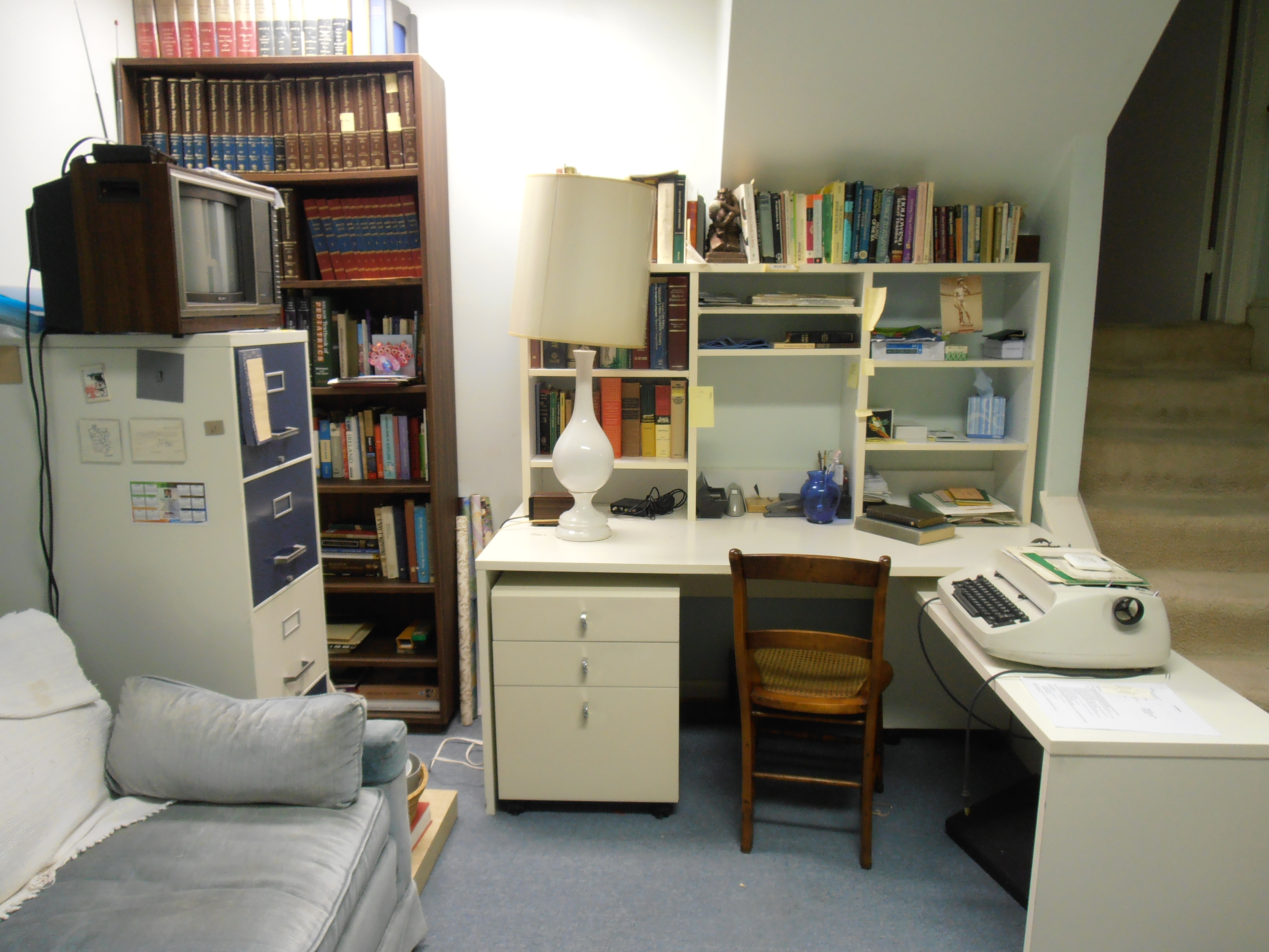 Dr. Calhoun and his wife, Edith, bought a house in Bethesda MD in 1964. It was a split level home located in Wildwood Manor. The purchase was made while the house was still under construction and the couple made a number of changes to various design elements, creating a home that reflected their tastes. The lower level was divided by the stairs from the entry level of the house. To one side was the laundry area and a workbench. On the side facing the street, with a window onto the front yard, was the area where Dr. Calhoun created his home office. Below are some photos of the office, taken well after his death but still very much as he left it when he died in 1995.